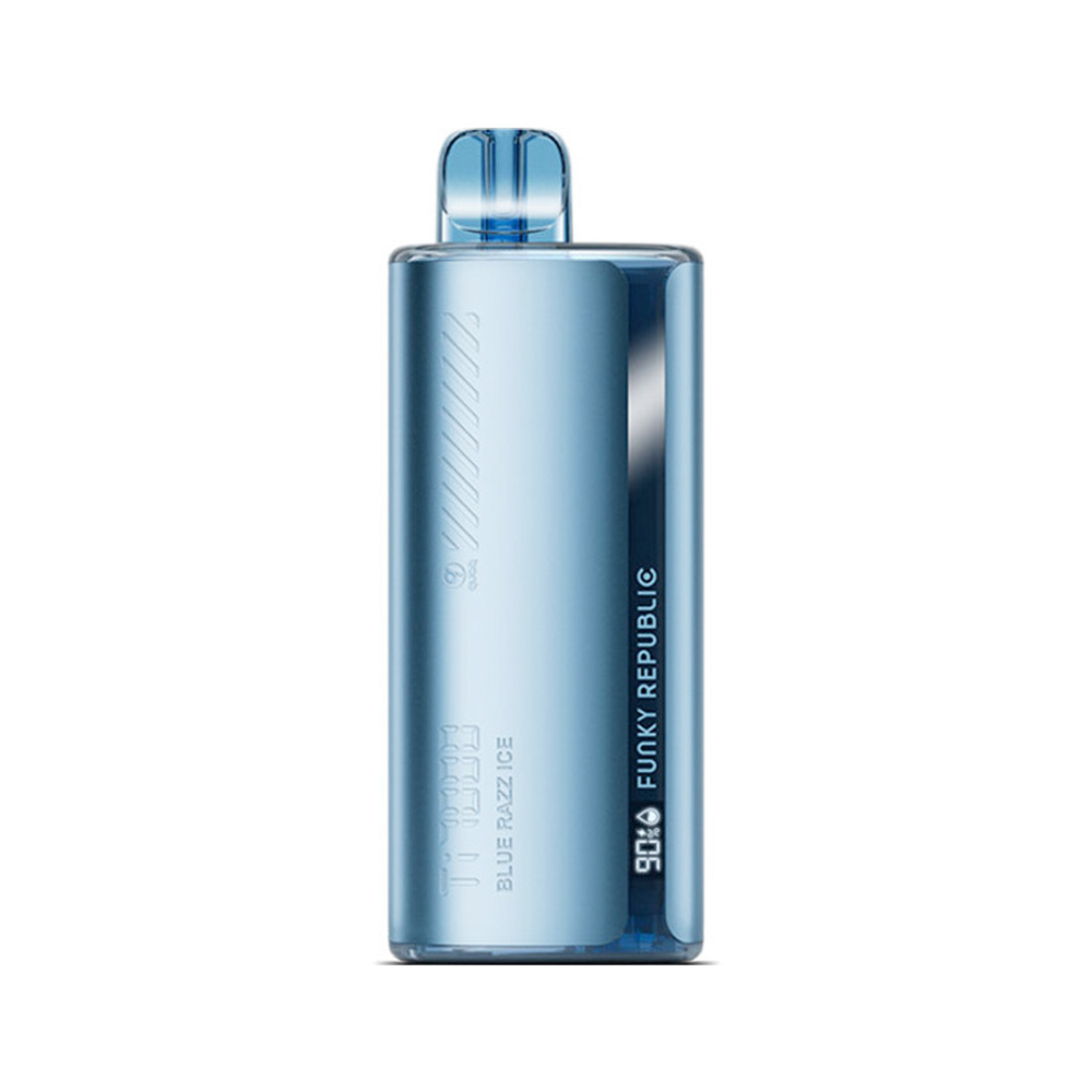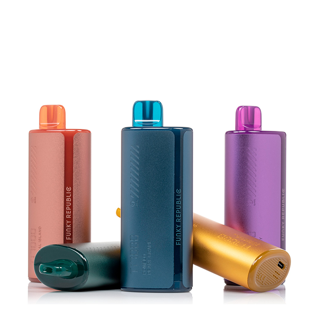 The Funky Republic Ti7000, by EBDESIGN (Formally called Elfbar), is the very first disposable vape to feature a digital display showing how much liquid is remaining in the device as well as a battery display showing the battery life down to the exact percent. Each Funky Republic Ti7000 contains a gigantic 17ml e-liquid reservoir featuring EBDESIGN liquid submerged around a mesh Quaq Tech Coil (same used in EBDESIGN BC5000 Ultra). The Ti7000 also features a larger 600mah battery, fast charge USB Type-C input, 5% Nicotine (50mg), and a refined luxurious case.